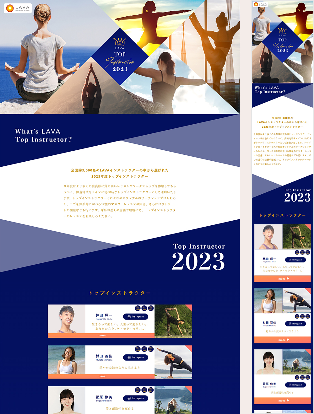 本ページでは、LAVAのブランド価値を支える“インストラクターの質の高さ”を伝えることを目的に、トップクラスの講師陣一人ひとりの魅力や想いが自然と伝わる構成を設計しました。