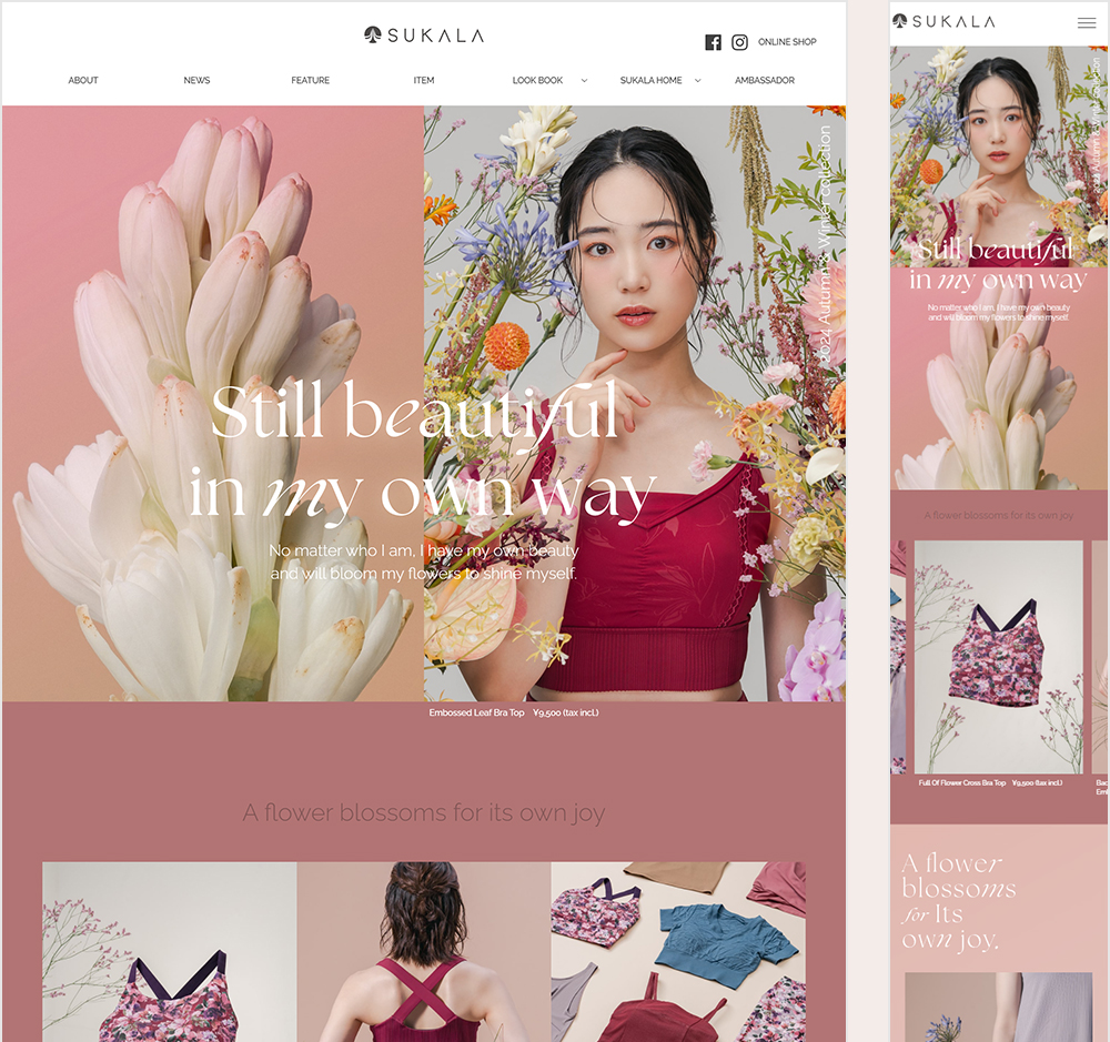 コレクションテーマに合わせ、ページ全体に花のあしらいを配置。 背景や装飾として控えめに取り入れることで、 主役であるモデルとウェアを引き立てながら、サイト全体に統一感とやわらかな強さを持たせています。