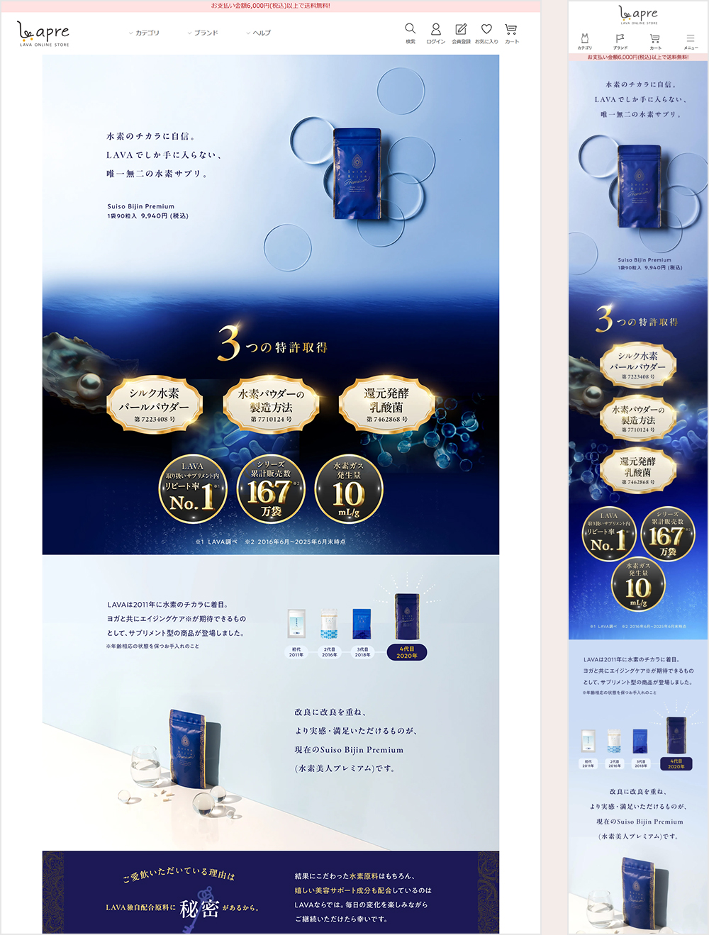 「Suiso Bijin Premium」の商品紹介ページにて、デザインおよびコーディングを担当しました。